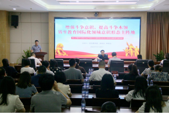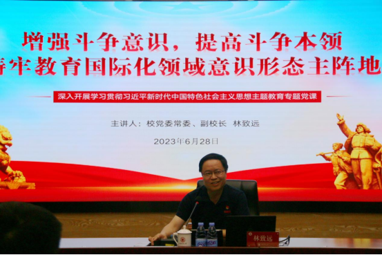 6月28日上午,校党委常委、副校长林致远在科技信息楼1607会议室以《增强斗争意识,提高斗争本领,筑牢教育国际化领域意识形态主阵地》为主题为全体政工干部和tyc5997太阳集团党支部党员讲授专题党课。