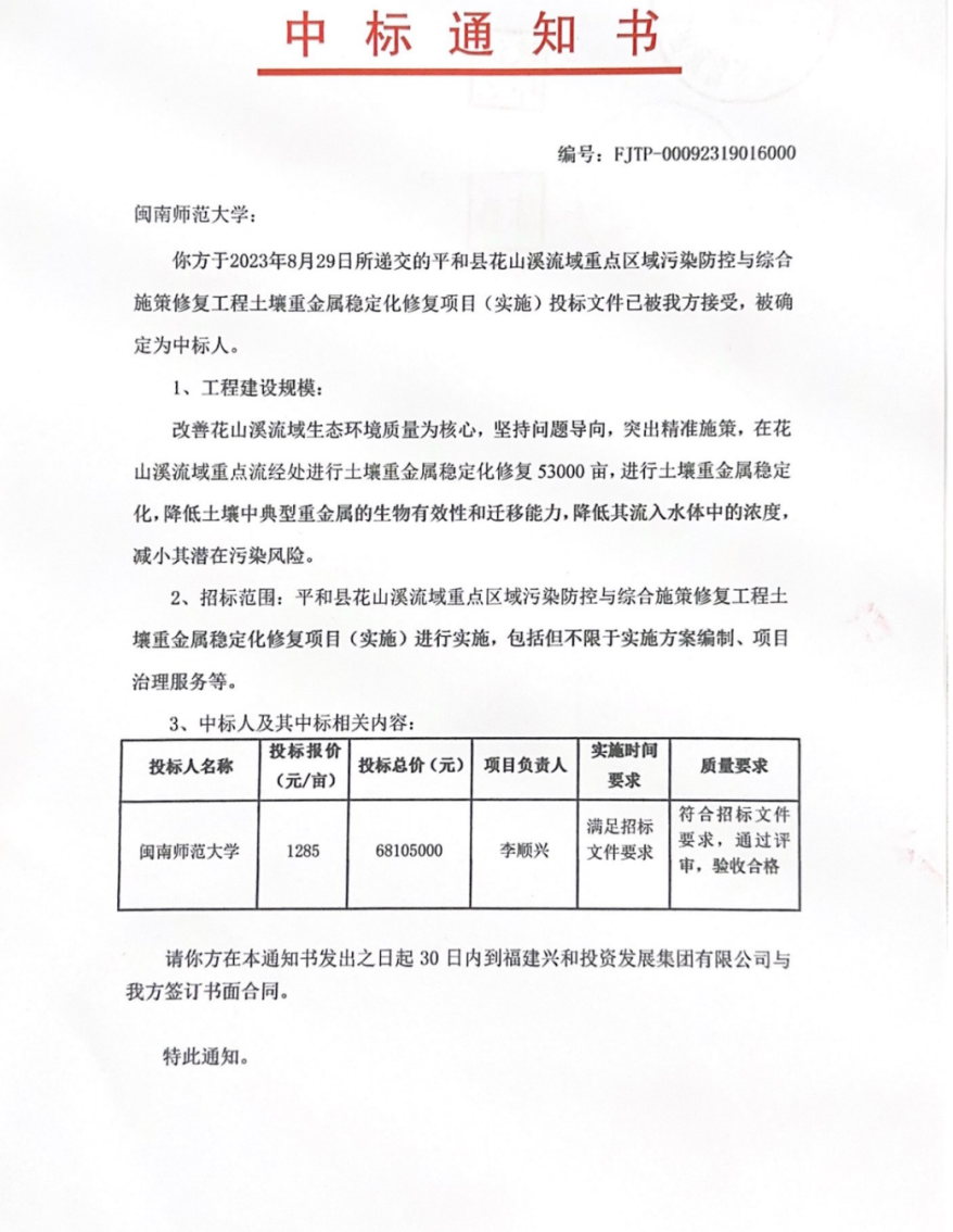 近日,我校李顺兴教授“环境与健康”团队中标“平和县花山溪流域重点区域污染防控与综合施策修复工程土壤重金属稳定化修复项目(实施)”,项目金额6810.5万元。同时,李顺兴教授牵头研发的“一种基于改性腐殖酸的土壤中铊稳定化技术”授权使用于平和花山溪土壤中铊污染治理,经化学化工与环境学院组织专家组评估、公开招投标,已转化成功,成交价410万元。这标志着我校在生态环境领域已具备较强的应用研究能力,有助于提升我校学科建设的贡献度和影响力。