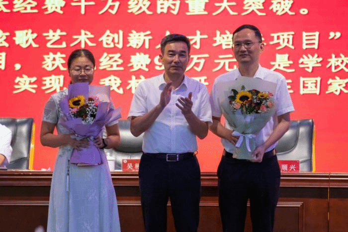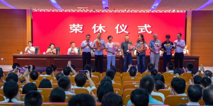 随后,举行新教师入职仪式和退休教职工荣休仪式。全体校领导为新入职教师代表佩戴校徽,新入职教师在大会上进行庄严的入职宣誓。校党委书记吴彬镪、校长李顺兴分别为退休教职工代表敬献鲜花。