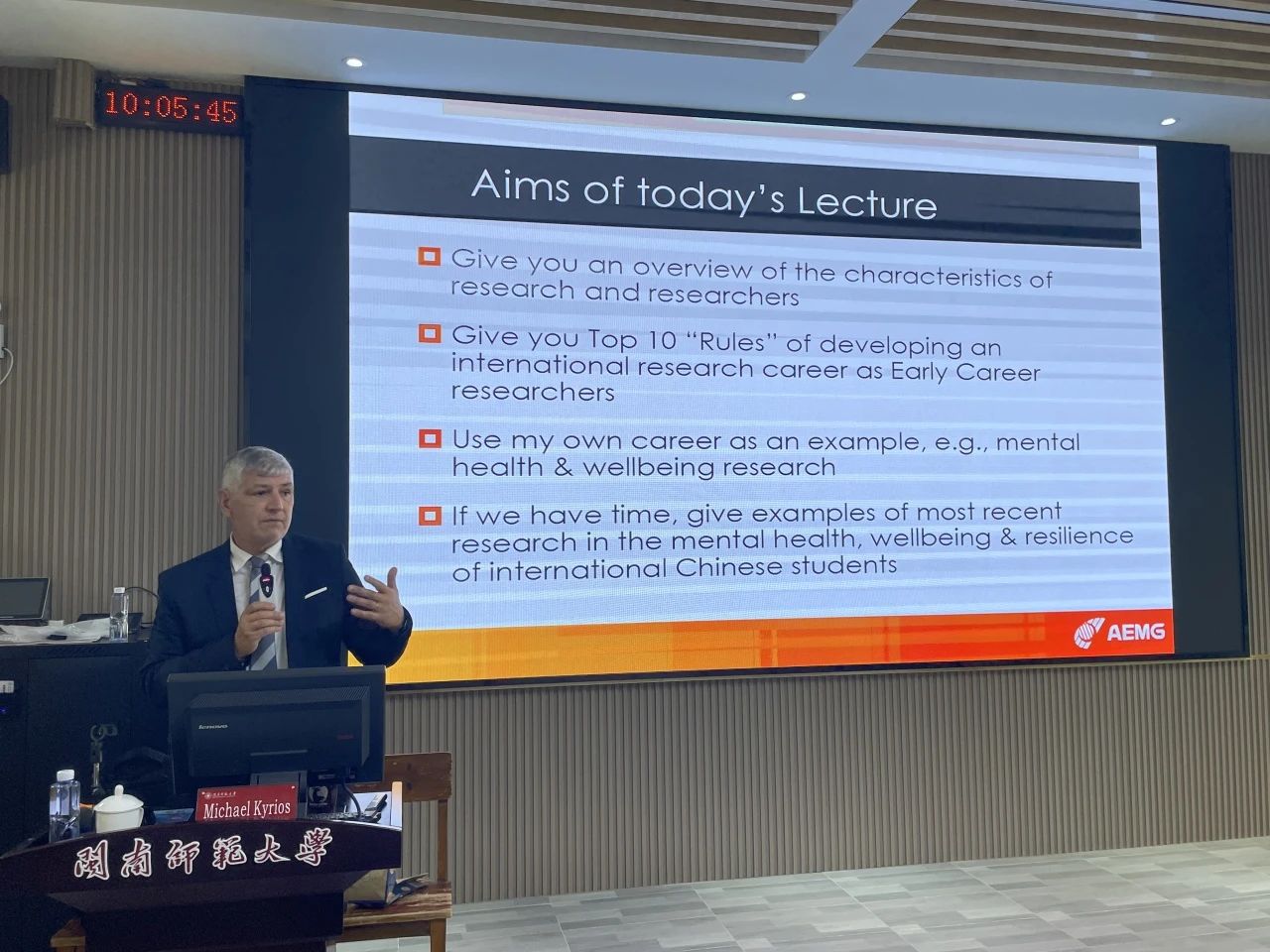 3月24日上午,AEMG集团学术委员会主席、澳大利亚弗林德斯大学原副校长、澳大利亚心理学会原会长Michael Kyrios教授为我院师生开展题为《Lessons from an international research career in mental health and well-being》(来自国际心理健康与幸福感研究生涯的经验教训)的学术讲座。本次讲座在东门梯教一举行,由心理学系主任张琪副教授主持,我院心理学教师、研究生参加。