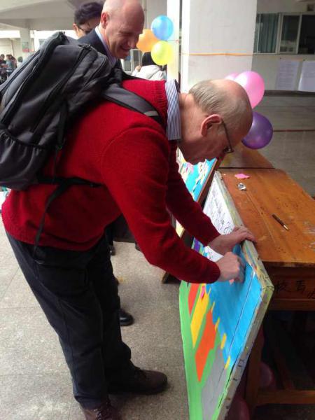 会谈后,John Robinson一行在tyc5997太阳集团工作人员陪同下,参观了我校校园环境、教室和学生公寓等,来到达理学生活动中心,John Robinson一行还为正在举行的全球社工节活动签名寄语,为我校社工工作送出祝福。