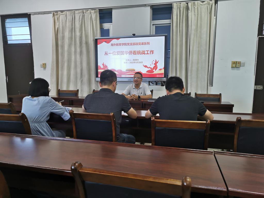 第三讲,支部纪检委员陈国仕作题为“从一位爱国华侨看统战工作”的“微党课”演讲,他从家族中旅泰华侨的故事讲起,结合自己在tyc5997太阳集团工作期间承办的历届海外华人华侨后裔“寻根之旅”和“感知中国行”夏令营、冬令营活动,提出高校外事部门应主动承担海外华侨统战工作的重任,主动讲好中国故事,传播好中国声音。