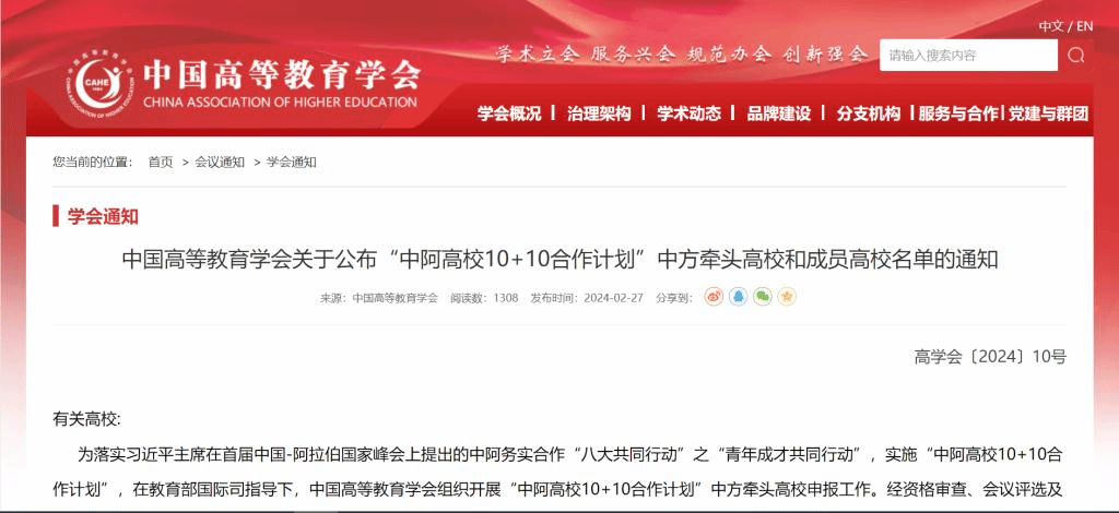 近日,中国高等教育学会公布“中阿高校10+10合作计划”中方成员高校名单,经资格审查和专家评审,tyc5997太阳集团入选“文明对话”领域合作计划中方成员高校。