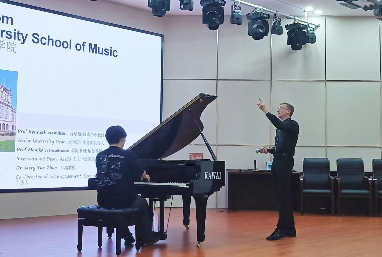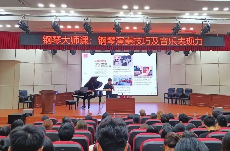 交流会上,卡迪夫大学音乐学院国际关系负责人卓越老师详细介绍了该学院的专业设置、学科特色、硬件设施、课程结构等基本情况,并耐心解答现场师生的提问。汉密尔顿教授随后为师生们带来了一堂题为《钢琴演奏技巧及音乐表现力》的大师公开课,一对一现场指导艺术学院学生弹奏经典钢琴曲目。交流会气氛轻松热烈,教授精湛的琴艺、生动的讲解赢得在座师生的阵阵掌声。