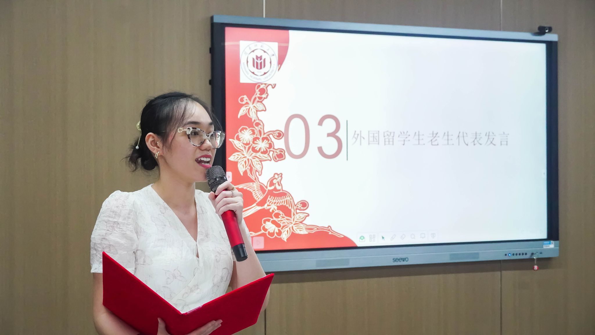 来自越南的黎氏芳青代表留学生老生发言。她用自己在校学习和生活的亲身体验,如参加“国际汉服日”和“中外名曲传唱大赛”等活动,向大家展现丰富有趣的校园文化魅力。她表示,尽管仍有思乡之情,新环境也在不断适应,但闽师的留学生活还是令人难忘的。她鼓励新生做一个有知识、有理想、有目标的人,在闽师这片沃土上绽放出独属于自己的耀眼光芒。
