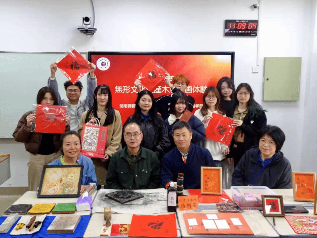 次日,漳州木版年画省级传承人颜朝俊作为嘉宾受邀为常叶大学师生一行介绍漳州木版年画传统手工艺的传承与发展,随后通过展示各式富有特色的木版年画文创产品,充分展现了漳州木版年画市场化和本土化的融合创新。从雕版技艺的历史脉络到拓印实操,日本师生在动手实践中感受非遗技艺的独特魅力和深厚文化底蕴。