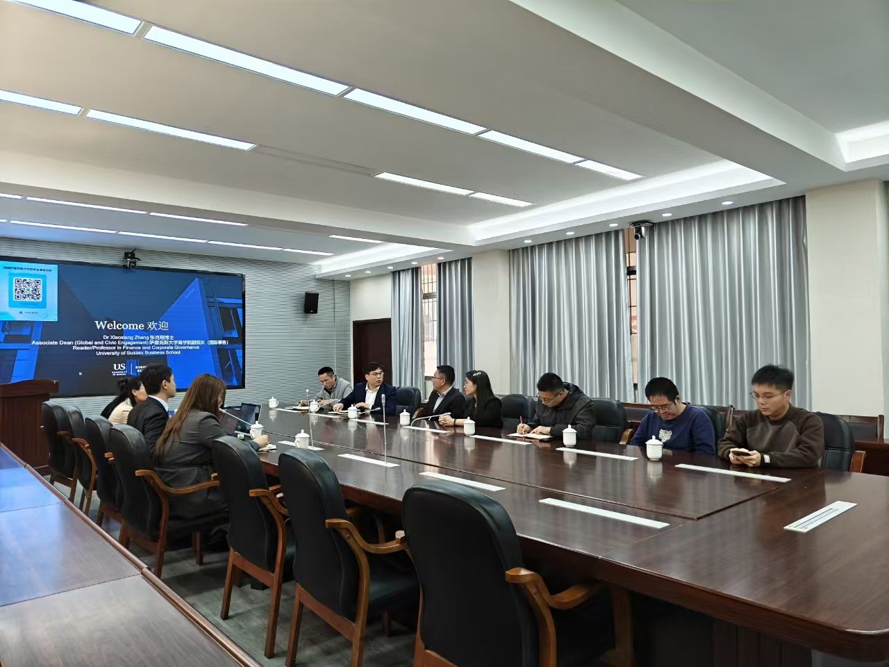 李庆瑶对张肖翔副院长一行的来访表示热烈欢迎。他表示,萨塞克斯大学是我校“中外高水平大学学生交流计划”2+2双学位联合培养项目的合作高校之一,近年来两校已建立了友好稳定的伙伴关系,并在课程对接、学分互认、分段联合培养等方面展开了广泛而深入的合作,期待能在此基础上深化两校硕博士导师软性互聘、科研课题联合申报、本科及硕士预科项目等领域的合作。张肖翔介绍了萨塞克斯大学的历史沿革、办学理念及商学院的学科排名、专业设置、师资团队等基本情况,并表示萨塞克斯大学已做好迎接首届中高项目生赴英学习的各项准备工作,希望能为同学们提供更优质和更丰富的学习及生活体验。随后,双方就师资共享、联合科研、人才培养、夏校课程及合作办学项目等事宜展开富有成效的探讨。