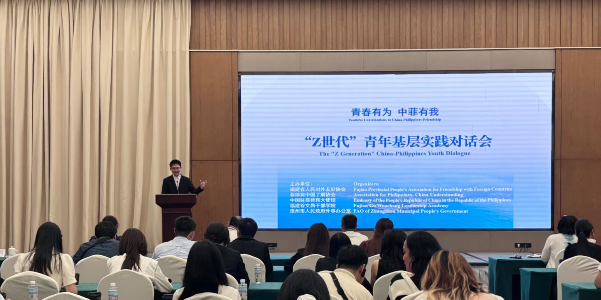 经严格选拔,我校5名优秀学子入选交流团队,与来自福建师范大学、福建中医药大学、华侨大学等高校的26名大学生代表一同担任志愿者,参与青年使者“结对子”活动。其中,4月24日在漳州东山县谷文昌干部学院举行的"青春有为,中菲有我——'Z世代'青年基层实践对话会"上,我校外国语学院李林炜作为中方青年代表,以英文发表主题演讲。通过阐释谷文昌精神对当代青年的启示,他深刻诠释了"荒漠变绿洲"的精神内涵,生动展现了中国青年在逆境中以责任担当铸就辉煌的精神风貌。此外,他还分享了中菲青年在活动期间携手合作、探索文化表达新路径的实践经验,其演讲引发在场学生共鸣,获得广泛赞誉。
