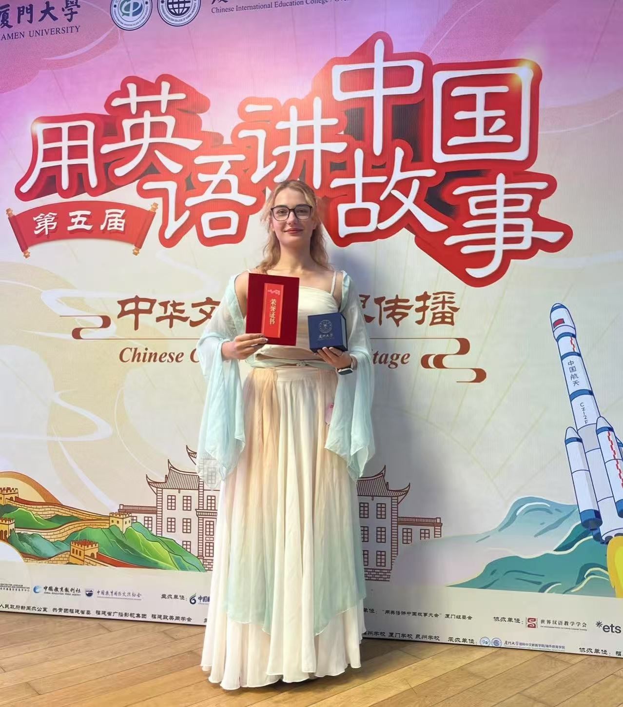 4月26日,第五届“用英语讲中国故事大会”来华留学生组高级阶段福建省专场圆满落幕。我校白俄罗斯籍留学生梦梵荣获二等奖,她以流利的英语讲述了自己在中国的求学经历,展现了对中华文化的热爱和理解。
