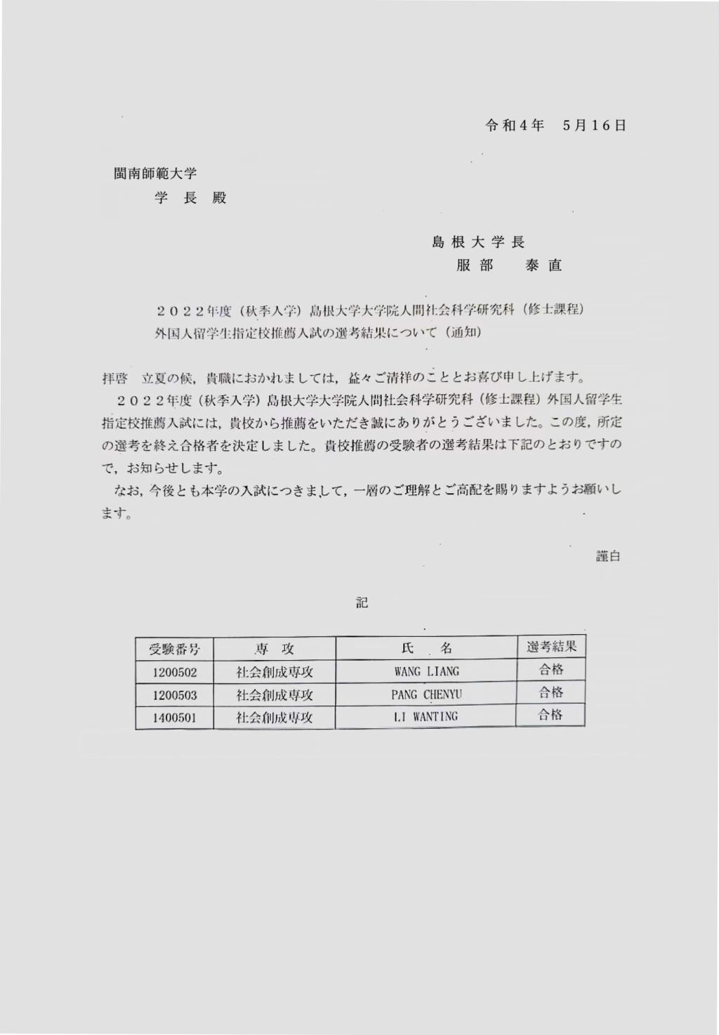 日本国立岛根大学是我校友好合作学校。两校自2015年签订合作协议以来,双方在师生交流、联合科研等方面开展实质性合作,成效显著。根据协议,岛根大学以特设奖学金的方式支持我校学生赴日交流学习。为此,我校成立“4+2”留日班,对有意赴日本深造的学生进行专门的日语辅导。截止目前,我校已先后选派28名学生赴岛根大学进行一个学期的交换学习。2020年,岛根大学成立人间社会科学研究生院,并经日本教育主管部门批准可在国外协议大学中招收保送研究生,我校被列为具有保送研究生资格的学校。2021年,我校商学院2017级李展云同学成功通过面试成为首位赴岛根大学攻读硕士的本科毕业生。今年,我校数学与统计学院庞辰宇、李婉婷、王靓3名学生被成功录取,将于2022年度秋季入学攻读硕士学位。