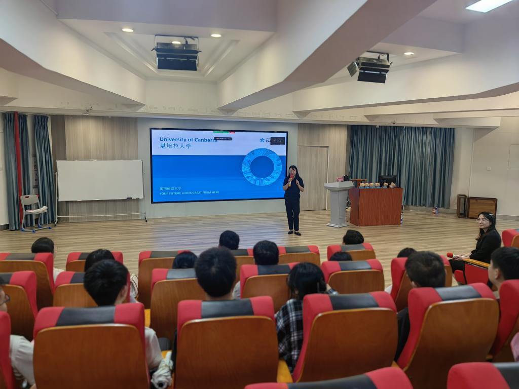 堪培拉大学国际招生部的李老师通过两段视频向同学们展示了堪培拉大学优越的地理位置和宜人的校园环境,并从学校排名、交通设施、生活环境、学生就业、奖学金申请等方面详细介绍了堪培拉大学的学习环境、学术氛围及该项目的特色优势、培养模式等情况。