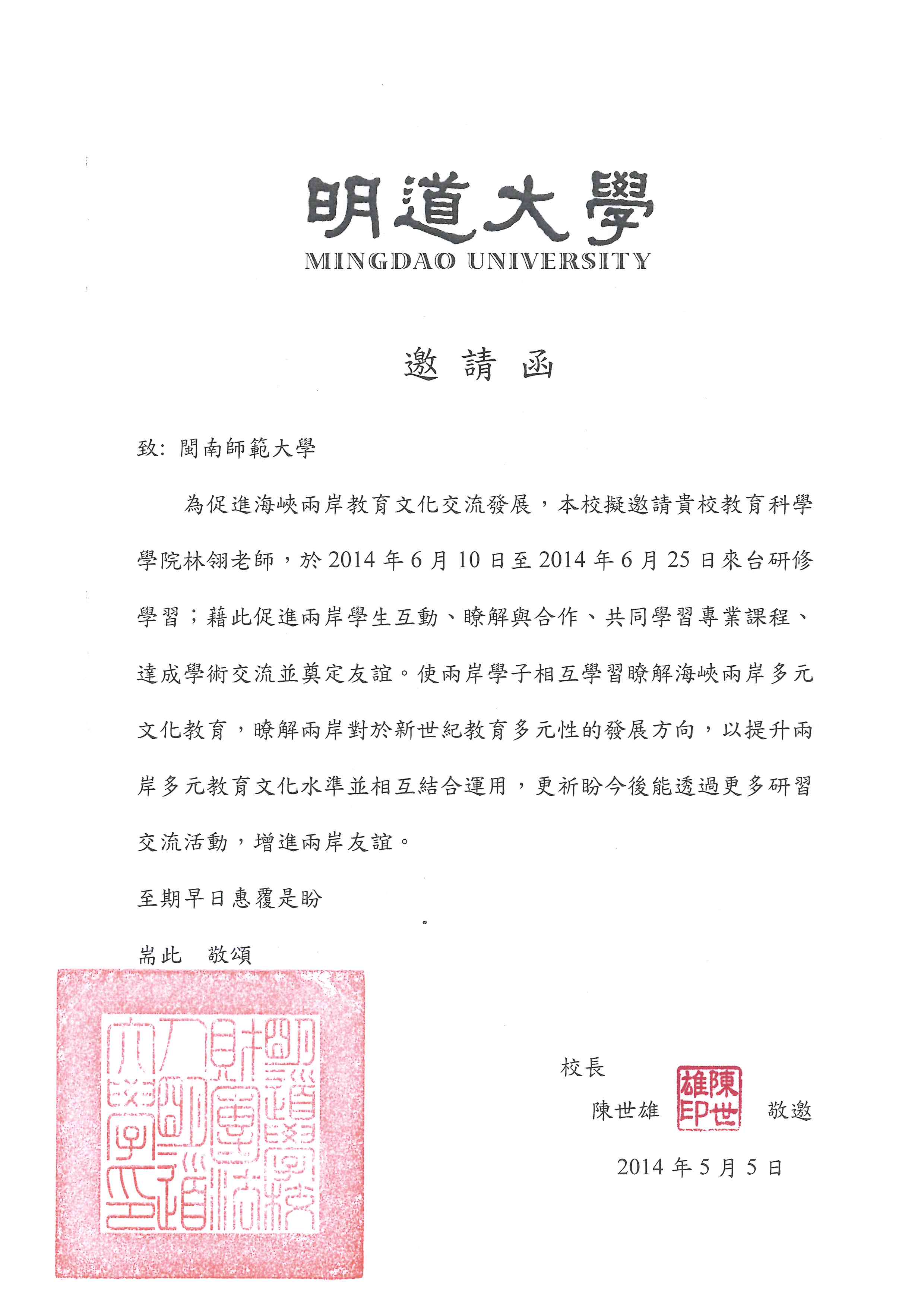 应台湾明道大学邀请,我校教育科学学院林翎老师拟于2014年6月10日至2014年6月25日赴台访学交流,在台停留时间16天。该同志赴台往返旅费及在台期间的有关费用由个人支出。