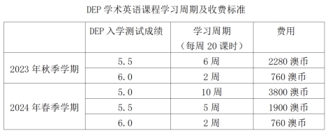 2、学术英语课程费用:学生需参加DEP学术英语直通课入学测试。如测试成绩达6.5分及以上者,可直接申请堪培拉大学本科课程;如成绩未达到6.5分者,可参加DEP学术英语课程学习,语言学习周期由入学测试成绩确定。DEP学术英语成绩认证费为480澳币。